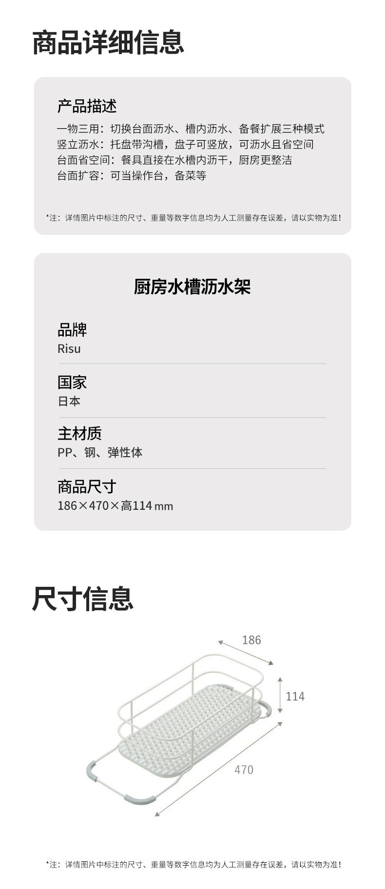 厨房水槽沥水架 186×470×114h