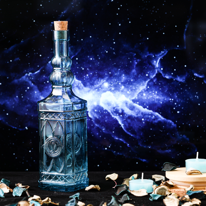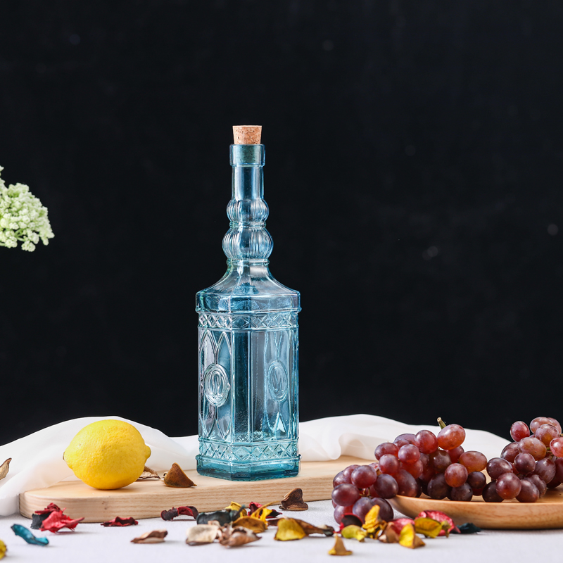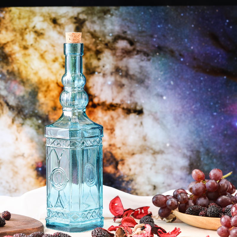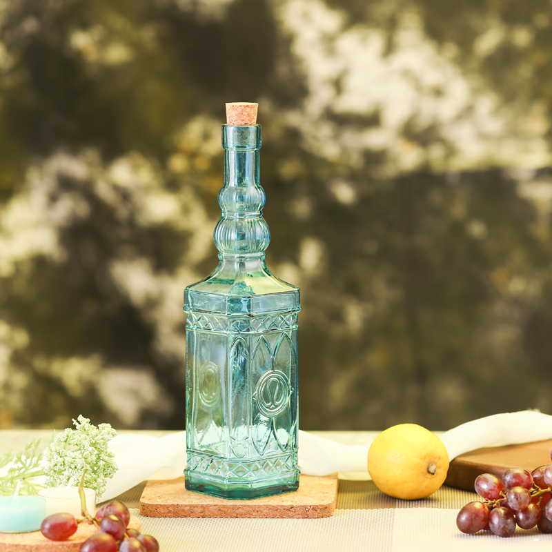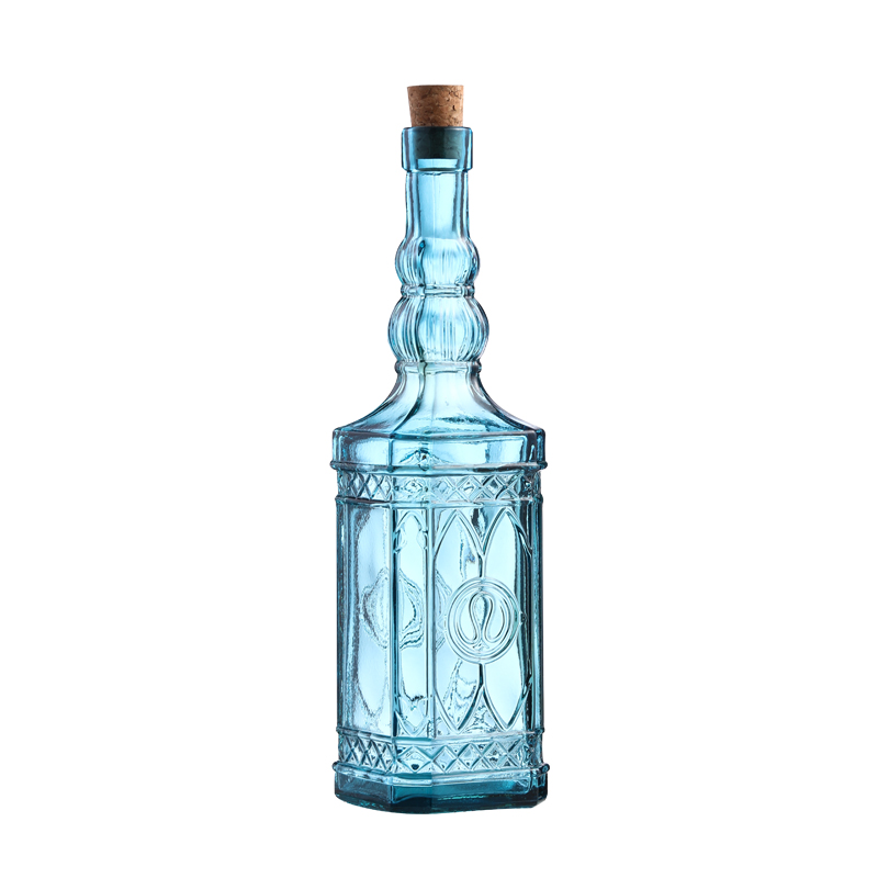 软木塞玻璃液体调味瓶 方花纹 天青色 500ml