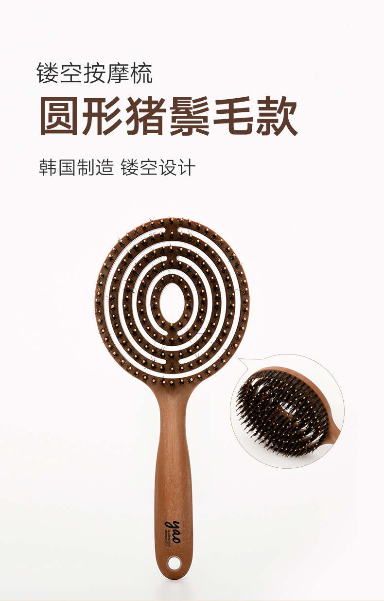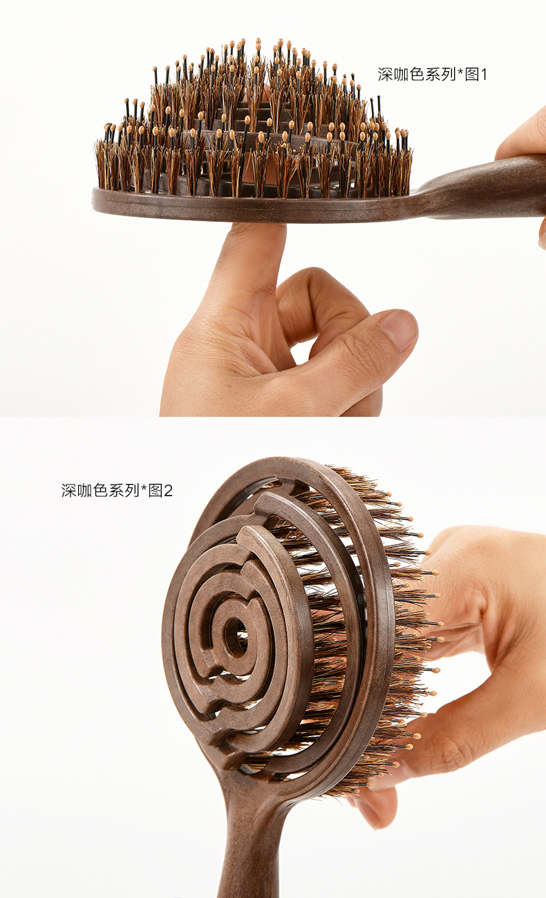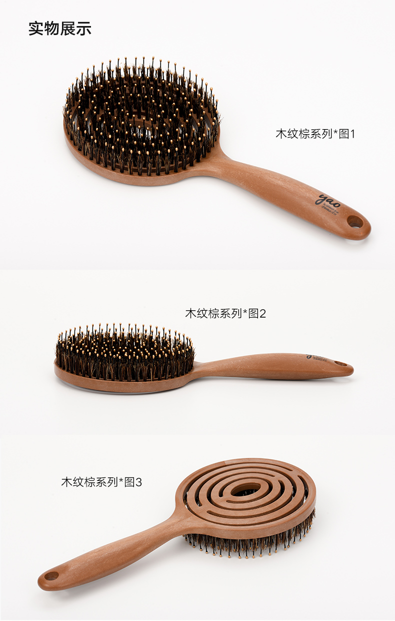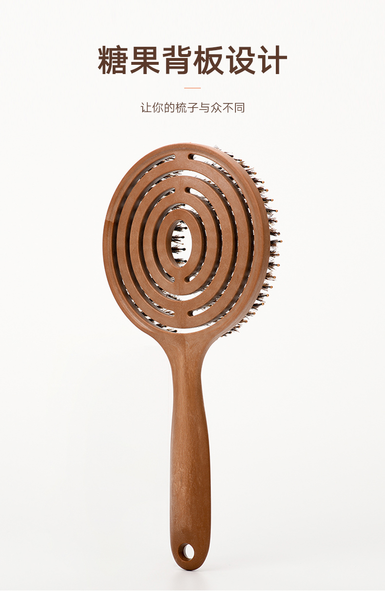 镂空按摩梳 圆形猪鬃毛款 木纹棕